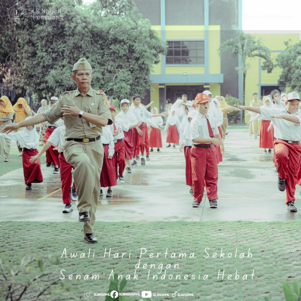 Mengawali hari pertama masuk sekolah dengan Senam Anak Indonesia Hebat dan upacara bendera dilanjutkan dengan mendengarkan lagu Hari Baru